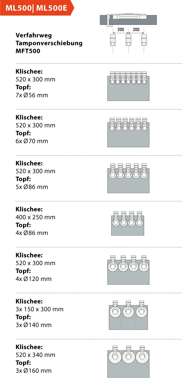 Die ML-Linie bietet mehrfarbige Tampondruckmaschinen mit elektrischer Positionierung und wählbarem pneumatischen oder elektrischen Tamponhub. Das Einstellen der Druckpositionen erfolgt über das grafische, mehrfarbige Touchdisplay. Der Druckablauf ist frei programmierbar. Es kann eine Vielzahl an Druckbildern auf ein Klischee positioniert werden. Diese sind individuell ansteuerbar, um so komplexe Druckbilder zusammenzusetzen oder verschiedene Varianten zu drucken. Auftragsdaten werden komplett abgespeichert und können für Wiederholaufträge jederzeit erneut abgerufen werden, was die Rüstzeiten deutlich reduziert. Druckpositionen können durch eine Kamera oder über eine Schnittstelle von einem übergeordneten System in Echtzeit korrigiert werden. Für das Teilehandling steht eine Vielzahl an Möglichkeiten offen: von der pneumatischen Verschiebung, einer elektrischen 2-achsigen Drehung über Vakuumklemmen und Teilesensoren, bis hin zur Korrektur der Teileposition durch eine Kamera.