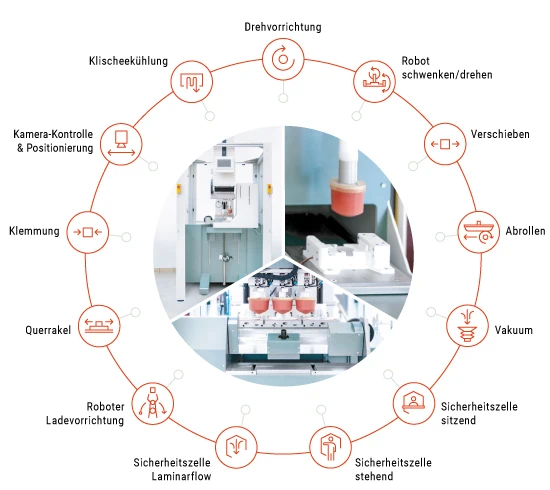 Für das selbständige arbeiten in einer Anlage wird mindestens die Tamponreinigungsüberwachung und der Viskomat empfohlen. Für hohe Ansprüche in der Produktionssicherheit können zudem die Füllstandsanzeigen für beide Einheiten sowie weitere Sensoren für Temperatur und Luftfeuchtigkeit ergänzt werden. Eine Klischeekühlung vermindert den Temperatureinfluss auf Farbübertragungs- und Topfzeit. Sicherheitszellen können speziell für Steharbeits- oder Sitzarbeitsplätze gestaltet werden. Diese können zusätzlich mit einem Rundschaltteller versehen und zur Staubminimierung mit einem Laminarflow ausgestattet werden.