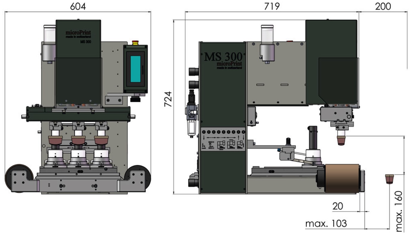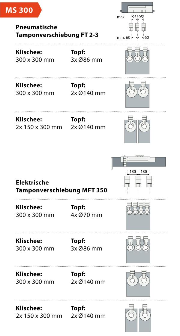 Die MS-Linie steht als Handarbeitsplatz sowie für die Integrationen in Anlagen für einfache wie auch spezielle Druckaufgaben bereit. Dank der internen mechanischen Positionierbarkeit sind die Maschinen in Anlagen ohne einen Kreuztisch einsetzbar. Der autonome Betrieb wird durch Überwachung des Reinigungsbands und dem Einsatz von Viskomaten sichergestellt. Der zurückfahrende Tamponkopf ermöglicht zudem eine leichte Beladung der Maschine durch einen Roboter. Das Druckgut kann elektrisch oder pneumatisch gedreht oder abgerollt werden. Für lange Druckbilder kann ein Ovaltopf oder ein Querrakler eingesetzt werden.