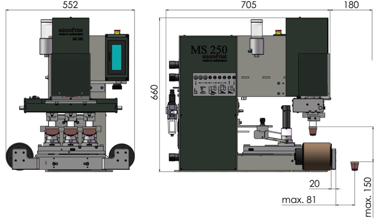 Die MS-Linie beinhaltet konventionelle pneumatische Tampondruckmaschinen, die bis zu 4 Farben drucken können. Sie ist mit offenem oder geschlossenem Farbgeber sowie als Querrakler verfügbar. Die Einstellung der Druckposition wird mechanisch an der Maschine vorgenommen. Sie ist vielfältig erweiterbar, u.a. kann sie mit einer pneumatischen oder elektrischen einachsigen Drehung oder Verschiebung des Druckguts ausgestattet werden. Die Bedienung erfolgt über einen grafischen einfarbigen Touchscreen. Eine Besonderheit an dieser Linie ist der vor- und zurückfahrende Tampondruckkopf. Hierdurch wird eine sehr gute Zugänglichkeit der Aufnahme erzielt. Das einfache und sichere Handling des Druckteils, wie auch die visuelle Prüfung des Druckbildes in der Aufnahme ist dadurch sichergestellt. Eine Beladung durch einen Roboter erhält zudem ausreichenden Freiraum.