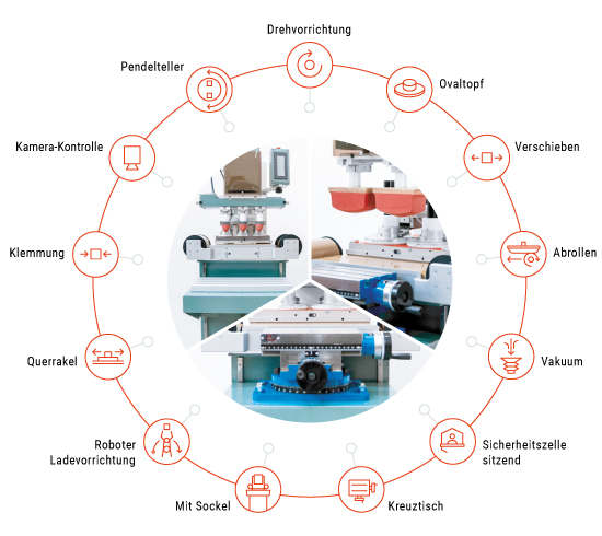 Das Teile-Handling ist flexibel gestaltbar. Neben dem pneumatischen Drehen und dem elektrische Drehen in einer Achse, kann auch eine pneumatische wie auch elektrische Teileverschiebung erfolgen. Der Runddruck ist über eine pneumatische Abrollvorrichtung mit Zahnstange möglich. Das Halten des Druckteils kann u.a. über pneumatisches Klemmen oder über Vakuum erfolgen. Wahlweise kann eine Teileerkennung über Vakuum oder Sensor angeschlossen werden.