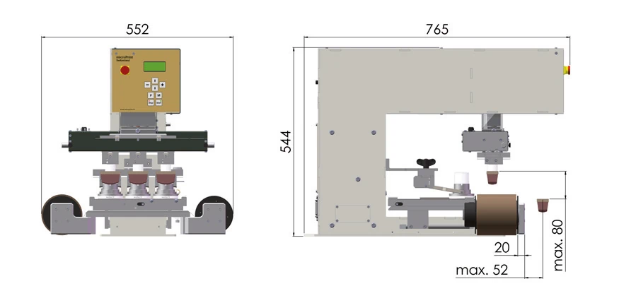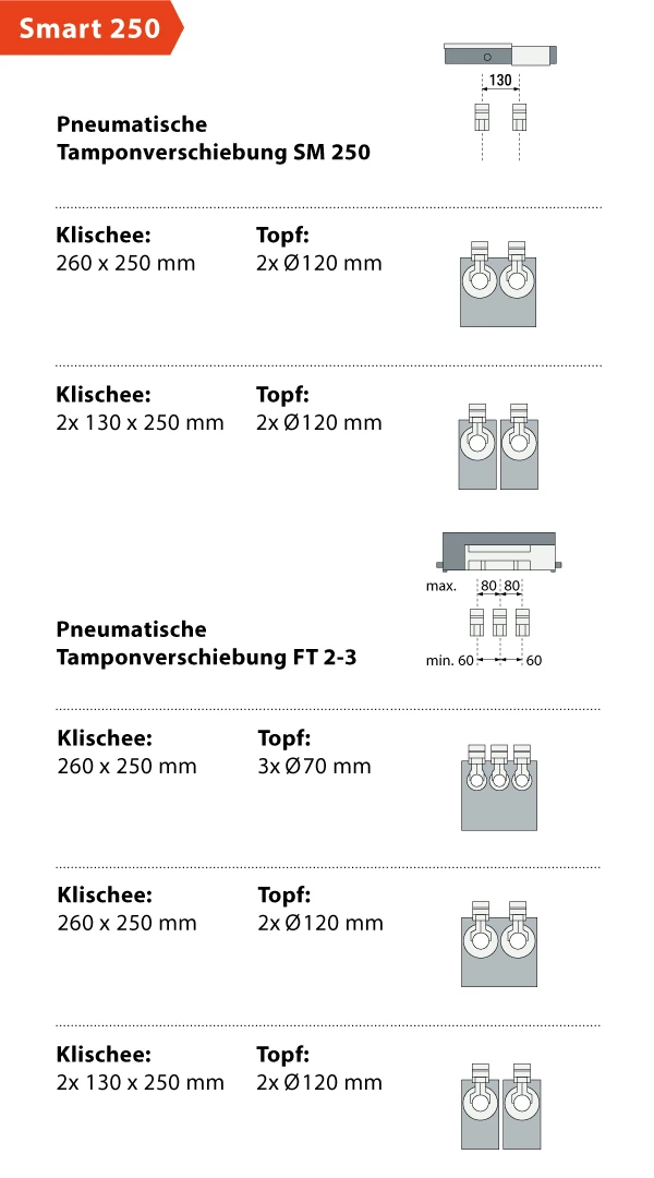 Der Tampon verfährt pneumatisch mit fixen Anschlägen. Das Druckgut muss über einen Kreuztisch positioniert werden. Die Tamponposition lässt sich frei über 2 Schwalbenschwänze mechanisch justieren. Für den Mehrfarbendruck stehen pneumatische 2- oder 3-Farben-Tamponverschiebungen zur Auswahl. Mit der 3-Farben-Tamponverschiebung wird die Farbabgabe zentrisch durchgeführt. Beim Druck von 2 Farben kann die Druckbildpositionierung bei Verwendung von 2 separaten Klischeehaltern in Xund Y-Richtung wie auch im Winkel durchgeführt werden.