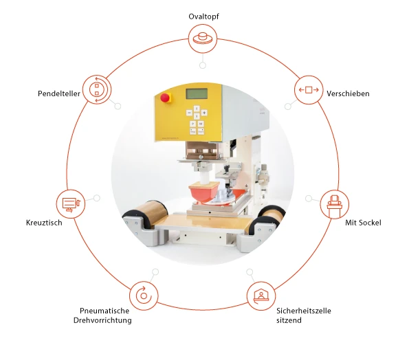 Das Druckgut wird manuell in die Aufnahme eingelegt und mit Hilfe des Kreuztisches positioniert. Ist die 2-farbige Bedruckung mit einer Tamponkombination durch eine Störkante nicht möglich, kann auch mit einem Einzeltampon 2-farbig gedruckt werden. Ein mehrseitiges Bedrucken des Druckgutes ist durch pneumatisches Drehen in einer Achse möglich. Mit einem Pendelteller kann während des Druckvorgangs das nächste Teil bereits eingelegt werden.