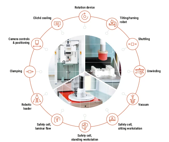 process using a linear drive with a holder in combination with a rotation device. For sensitive printing processes (including printed electronics, opaque or translucent printing), we recommend using an electrically powered pad stroke.