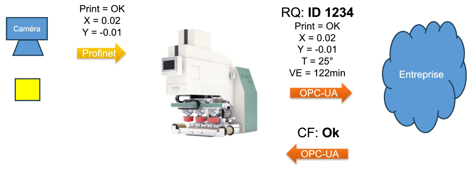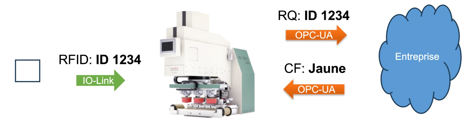 Dans une configuration complète d'Industrie 4.0, chaque pièce à imprimer reçoit un identifiant unique. Via un lecteur RFID connecté à la machine par IO-Link, cet identifiant est lu et la machine interroge le logiciel de l’entreprise via OPC-UA pour déterminer le motif ou la couleur nécessaires. Le produit est alors personnalisé en fonction de cette information.